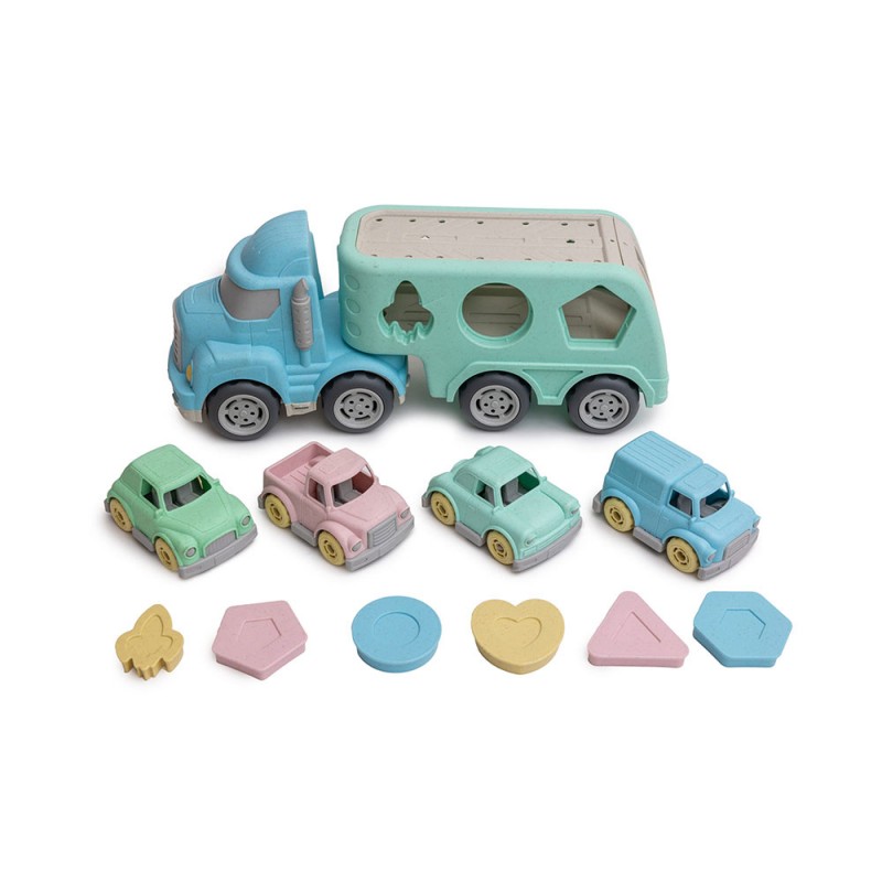 Veículo de transporte alusivo ao universo de construção civil com cores apelativas ao mundo dos brinquedos verdadeiramente ecológicos e sustentáveis. Inclui Camião e 4 carrinhos transportáveis.