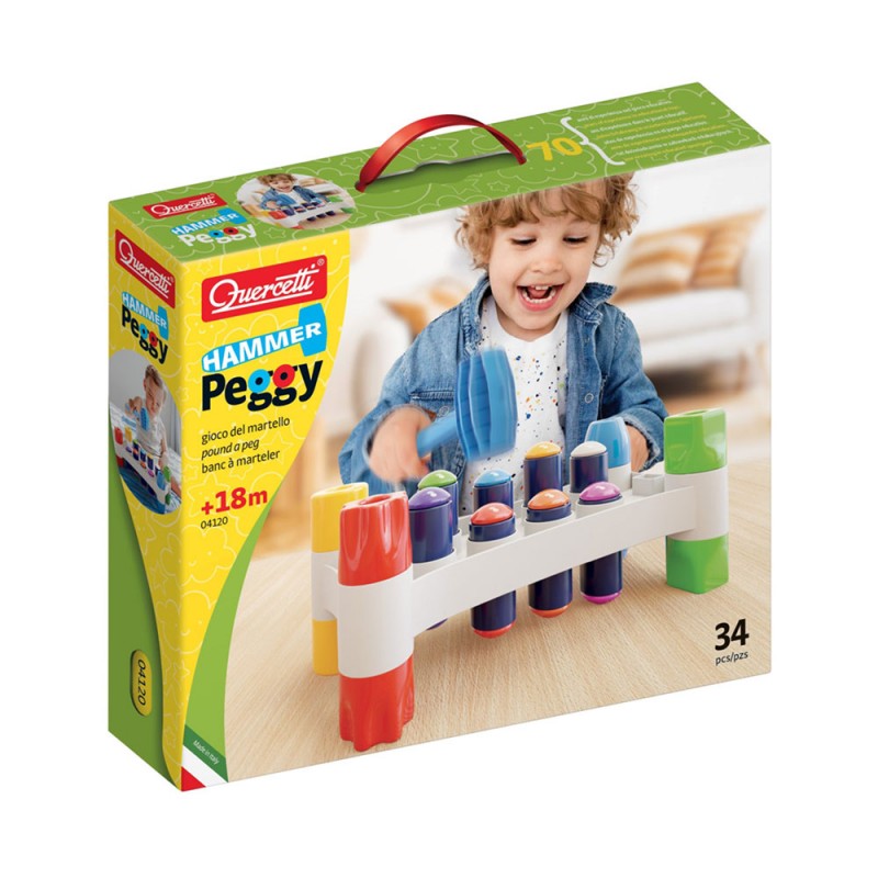 As crianças divertem-se martelando as peças coloridas com o martelo e, depois de inseri-las todas, começam de novo girando o brinquedo.
